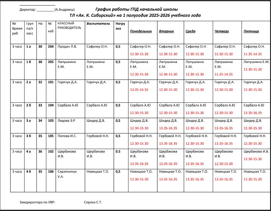 График работы ГПД начальной школы